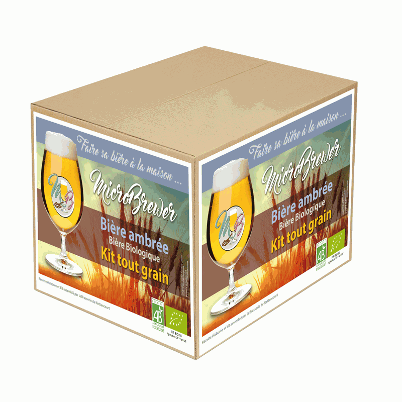 Un kit bière ambrée (amber ale) bio tout grain, pour obtenir une bière à la robe ambrée claire coiffée d'une fine mousse couleur beige. Nez doux sur notes grillées, bouche délicatement caramel, amertume florale délicate.