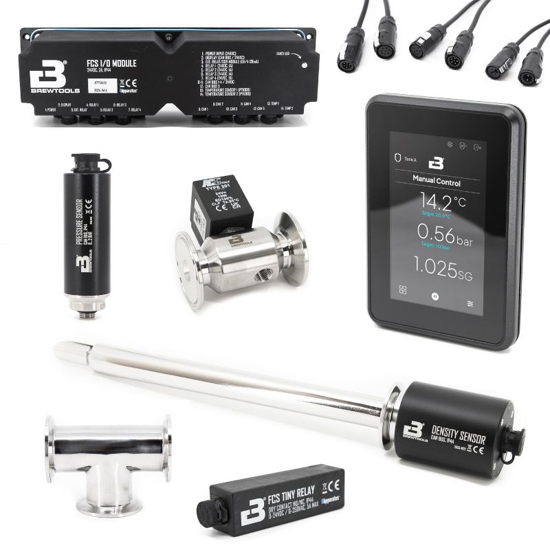 Ce pack rassemble les éléments essentiels : capteur de densité numérique, sonde de température, spunding valve pilotée, module relais Tiny Relay, et l’interface nécessaire pour les connecter à l’écosystème FCS. Il s’adresse aux brasseurs souhaitant passer d’une observation manuelle à un pilotage de fermentation en temps réel, avec la rigueur d’un laboratoire brassicole.