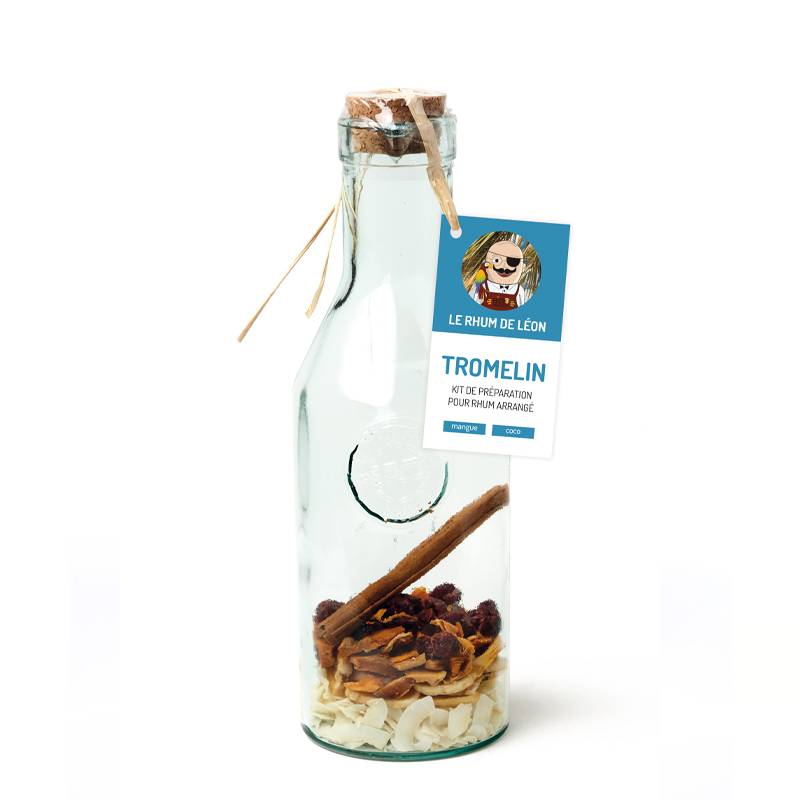 Le kit pour rhum arrangé « Tromelin » aux accents coco et mangue ! Ajoutez 60 cl de du rhum de votre choix , deux cuillères à soupe de sucre, ou mieux encore de sucre de canne, laissez macérer votre rhum arrangé pendant un mois et filtrez ; vous obtenez un rhum arrangé aux accents des îles que vous pourrez déguster ou même utiliser pour relever certaines de vos recettes pâtissières.