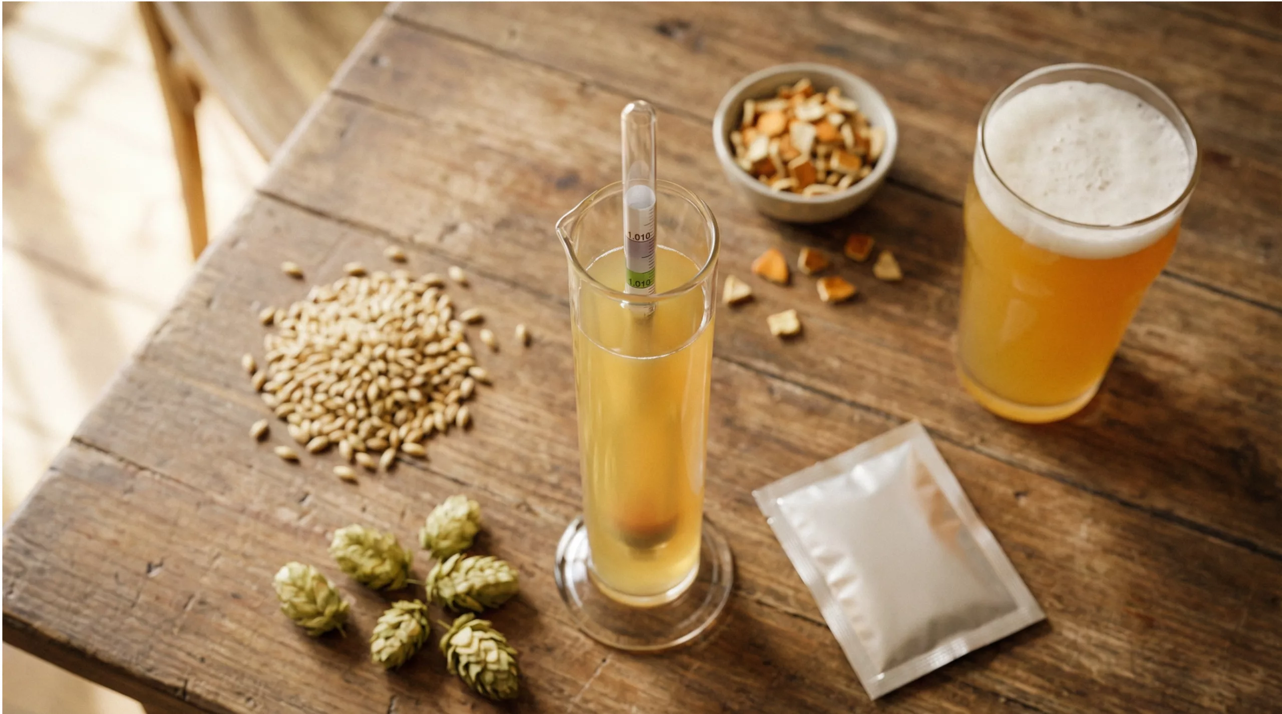 La mesure régulière de la densité est l’outil de contrôle principal. Après l’empâtage et le rinçage, la densité pré-ébullition doit être très basse, autour de 1.005 à 1.008, confirmant que la quantité de sucres extraits est bien limitée. Le test à l’iode reste indispensable : même avec une faible quantité de grains, il faut s’assurer que la conversion de l’amidon est complète. La présence d’amidon résiduel (coloration bleue-noire) indiquerait un empâtage insuffisant et pourrait générer des faux-goûts et un trouble indésirable. Avant d’ensemencer la levure, la densité initiale (DI) doit être mesurée avec un densimètre ou un réfractomètre et doit se situer autour de 1.010. En fin de fermentation, la densité finale (DF) autour de 1.006 confirme la faible production d’alcool.