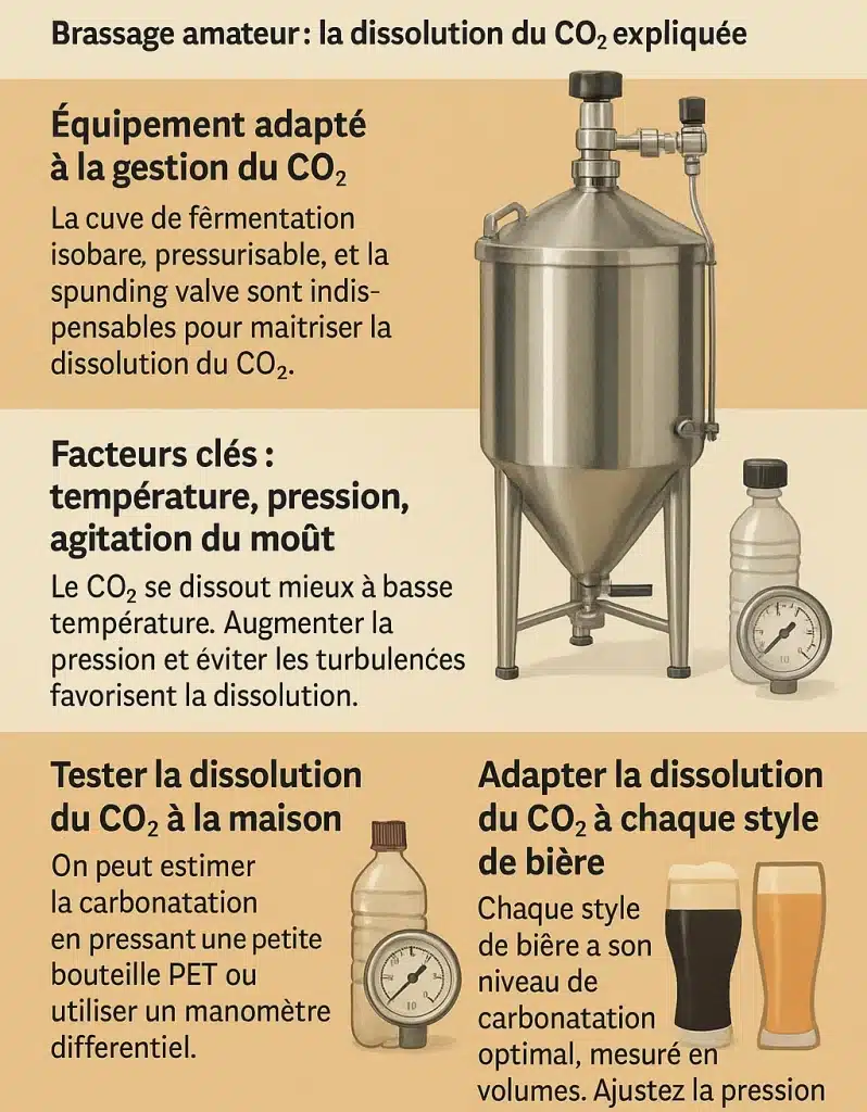 Le brasseur amateur qui souhaite maîtriser la dissolution du CO₂ doit disposer d’un équipement adapté. La cuve de fermentation isobare, pressurisable, est indispensable pour retenir le gaz. L’ajout d’un manomètre, d’un joint étanche et idéalement d’une spunding valve (valve de décharge réglable) permet de contrôler précisément la pression dans le fermenteur.